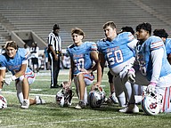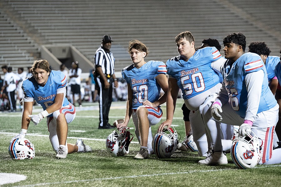 Seabreeze players take a knee while Allied Health Academy Director Kelley Lemon checks Jeremias George after he collapsed following a hard hit in the game against Atlantic at the Daytona Stadium on Friday, Oct. 3. Photo by Michele Meyers