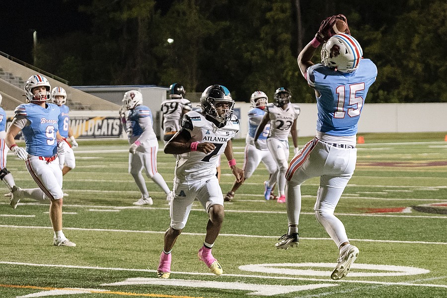 Another catch by Seabreeze linebacker Edison Parra (15) in the game against Atlantic at the Daytona Stadium on Friday, Oct. 3. Photo by Michele Meyers