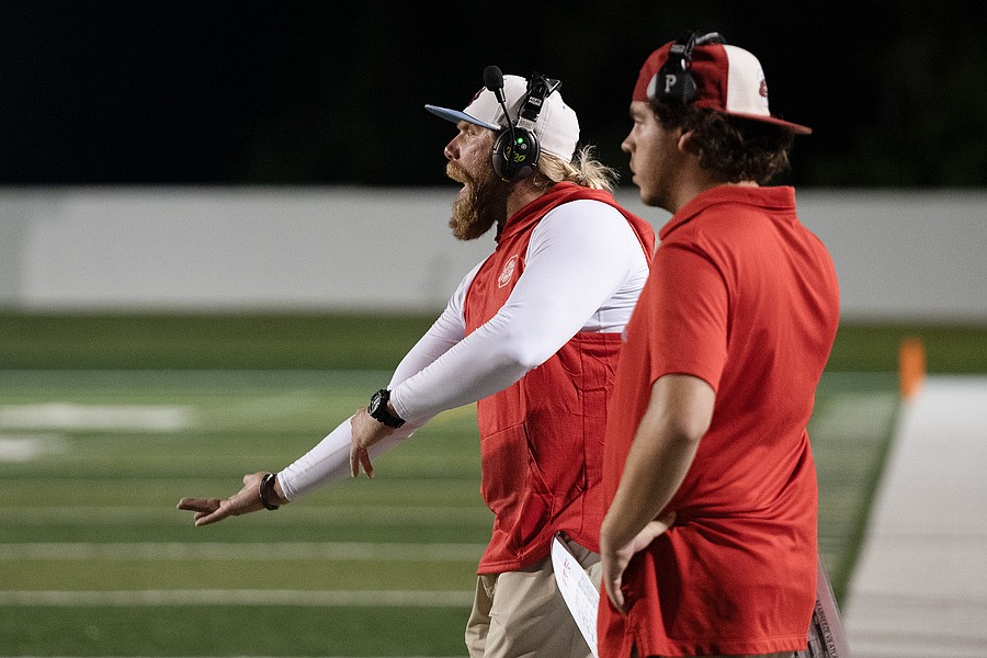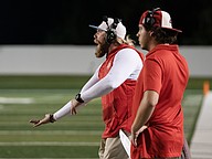 Seabreeze head coach Mike Klein (left) communicates with his team during the Atlantic game at the Daytona Stadium on Friday, Oct. 3. Photo by Michele Meyers