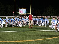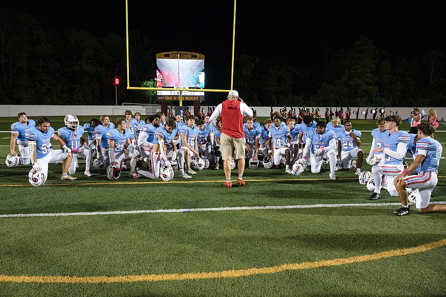 Seabreeze head coach Mike Klein (center) talks to his team following the 26-6 win over Atlantic at the Daytona Stadium on Friday, Oct. 3. Photo by Michele Meyers