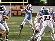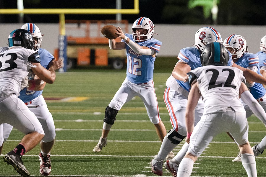 Seabreeze quarterback Jayce Gainer (12) looks for options during the game against Atlantic at the Daytona Stadium on Friday, Oct. 3. Photo by Michele Meyers