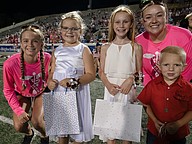 Adelynn Smurdon (left), Finley Harris (second from left), Michaela Smurdon (third from left), Maggie Harris (second from right) and Tucker Harris (right) give gifts to the Seabreeze Homecoming king and queen at the Daytona Stadium on Friday, Oct. 3. Photo by Michele Meyers