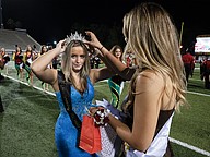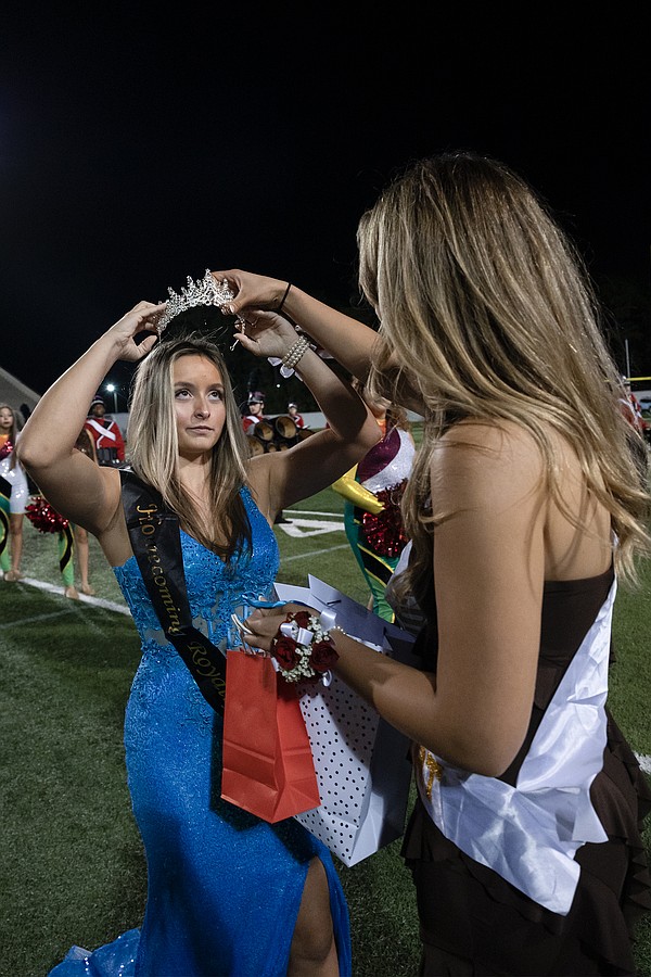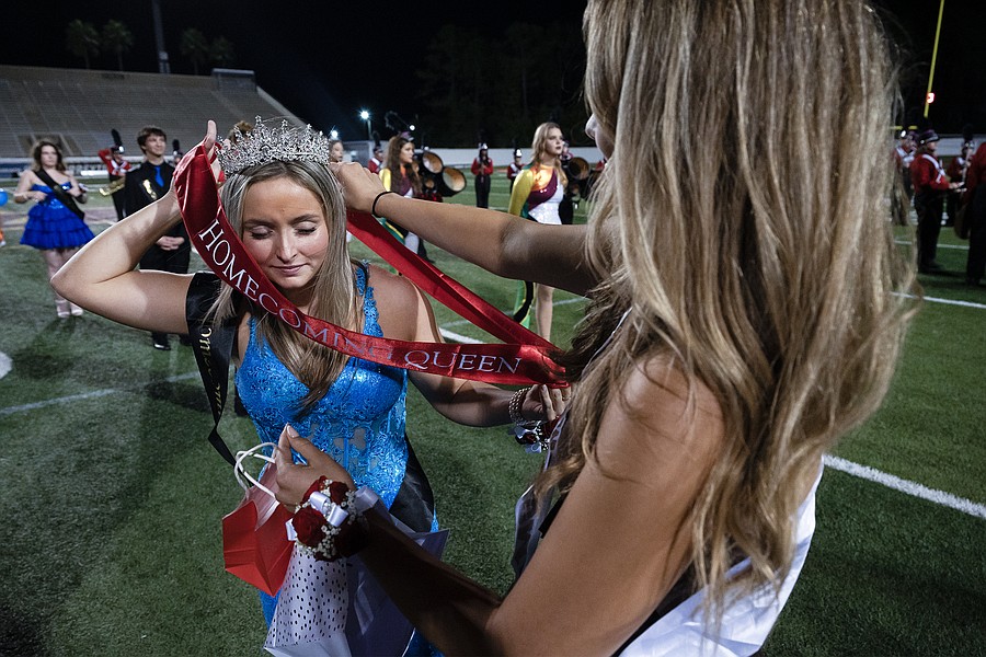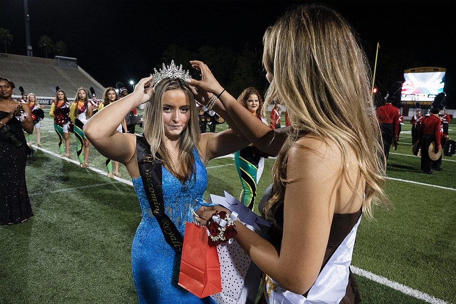 Seabreeze junior Jade Benchetrit (right) helps homecoming queen Hayden Alexander with her crown at the Daytona Stadium on Friday, Oct. 3. Photo by Michele Meyers