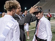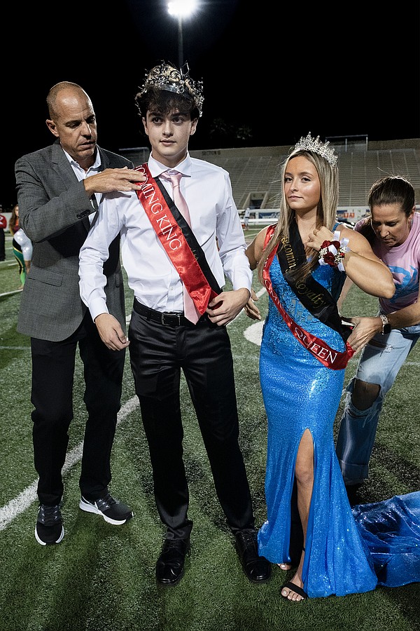 Seabreeze principal Tucker Harris (left) and cheer coach Amie MacDonald (right) put the finishing touches on the new homecoming king Shane Triplett (left, center) and queen Hayden Alexander (right, center) at the Daytona Stadium on Friday, Oct. 3. Photo by Michele Meyers