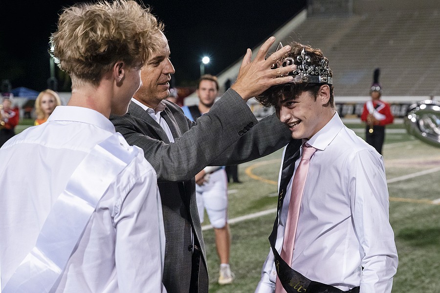 Seabreeze principal Tucker Harris (left) smiles as junior Dallas Cannon (center) congratulates new homecoming king Shane Triplett (right) at the Daytona Stadium on Friday, Oct. 3. Photo by Michele Meyers