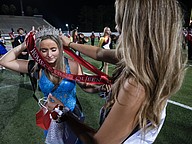 Seabreeze junior Jade Benchetrit (right) helps homecoming queen Hayden Alexander with her sash at the Daytona Stadium on Friday, Oct. 3. Photo by Michele Meyers