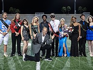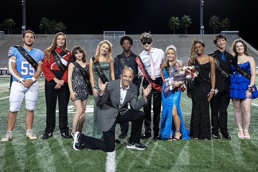 Seabreeze principal Tucker Harris (center, front) joins the senior 2025-2026 homecoming court at the Daytona Stadium on Friday, Oct. 3. Photo by Michele Meyers