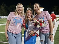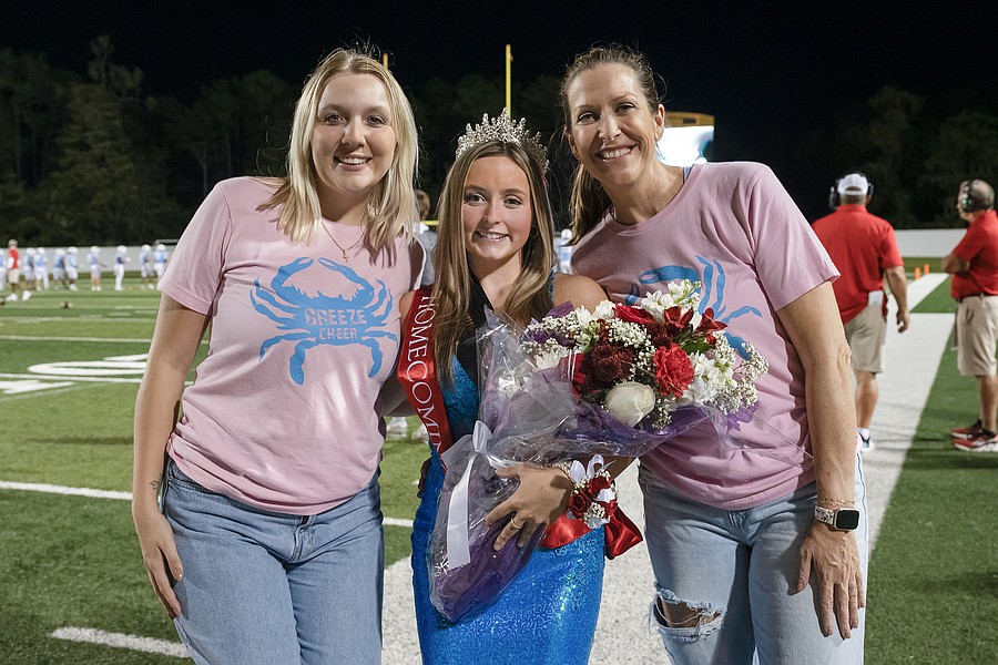 Seabreeze Homecoming queen Hayden Alexander (center) takes a photo with her cheer coaches Lauren Ott (left) and Amie MacDonald (right) at the Daytona Stadium on Friday, Oct. 3. Photo by Michele Meyers