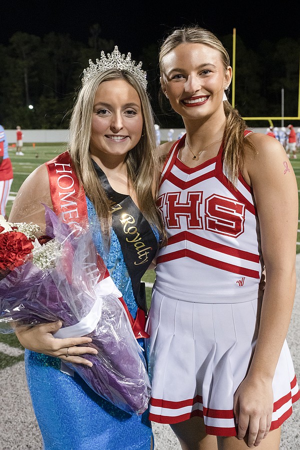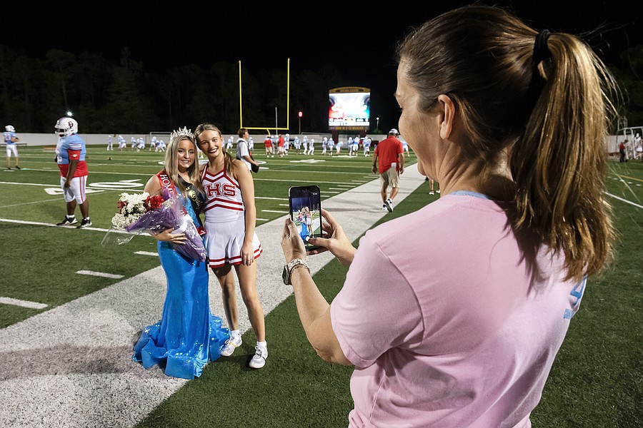 Seabreeze Homecoming queen Hayden Alexander (left) takes a photo with her friend Lyla Roberson (right) at the Daytona Stadium on Friday, Oct. 3. Photo by Michele Meyers