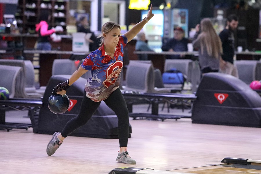 FPC's Victoria DaSilva-Carvalheira bowls in a match against Seabreeze at Palm Coast Lanes. Photo by Brent Woronoff