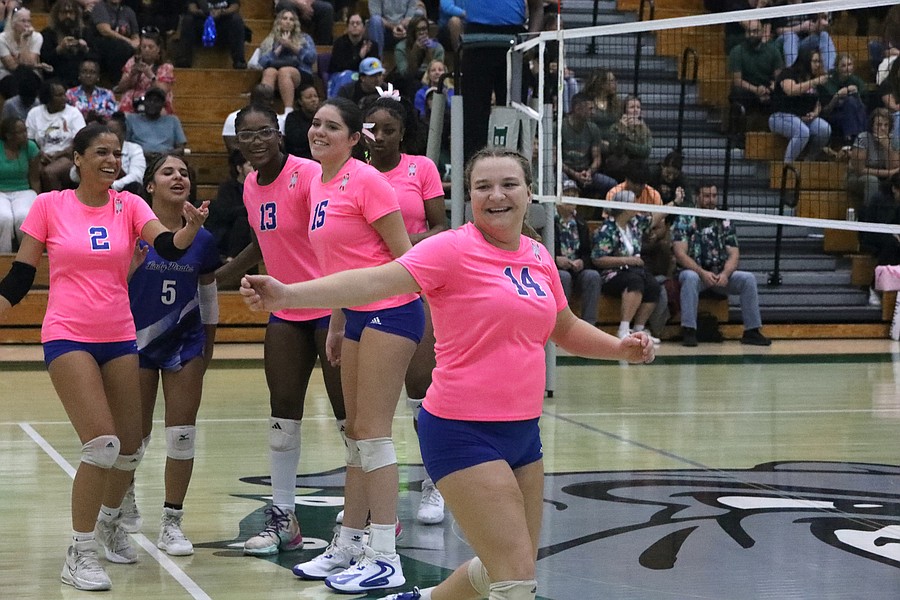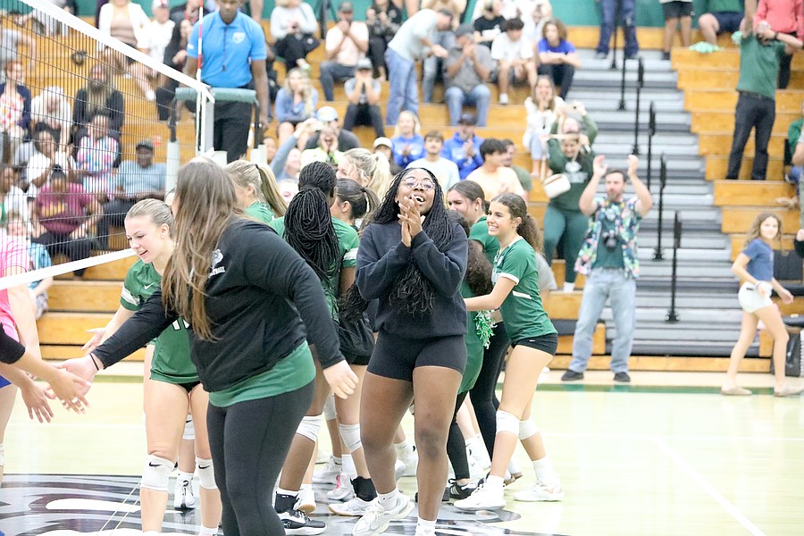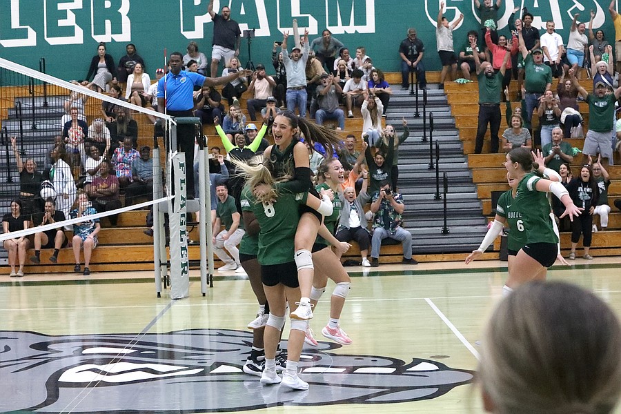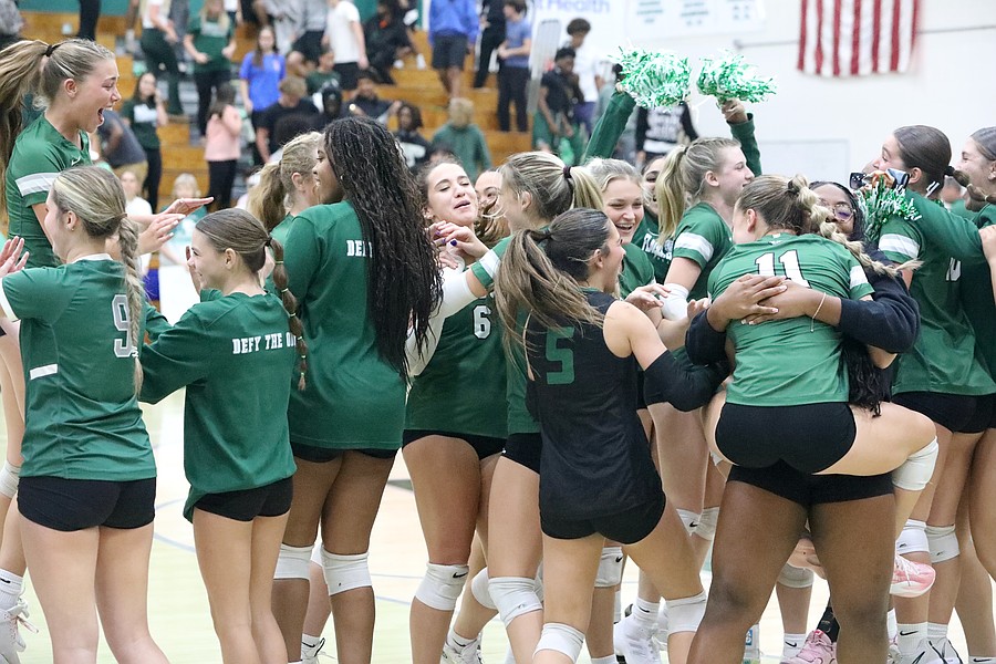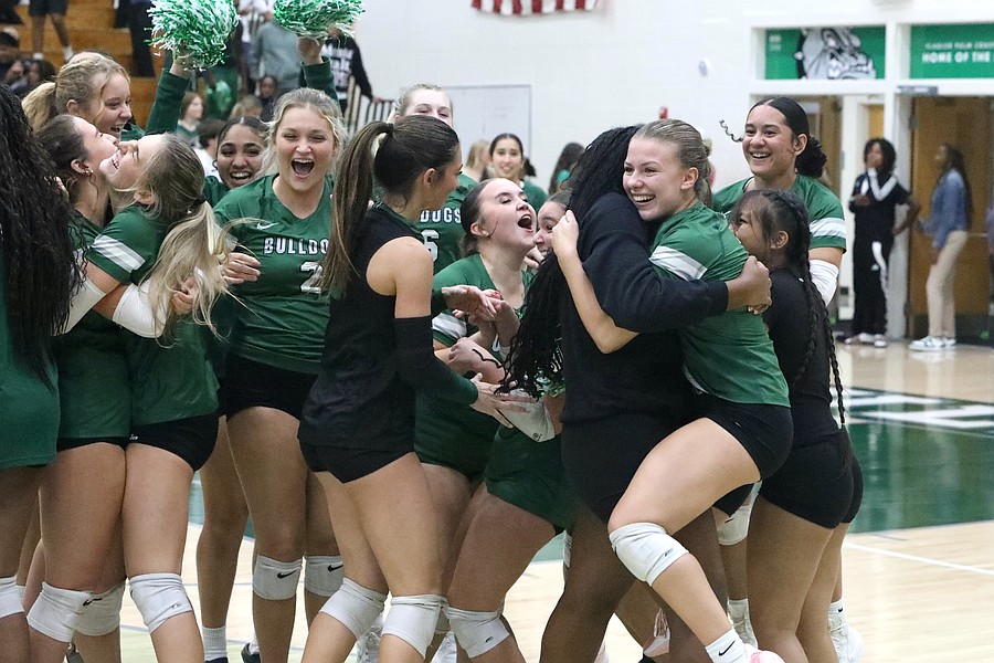 The Flagler Palm Coast Bulldogs celebrate their first volleyball victory over Matanzas since 2019. Photo by Brent Woronoff