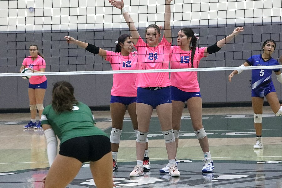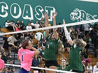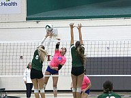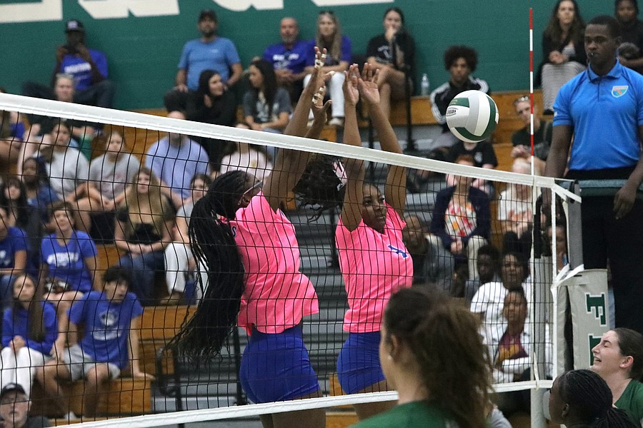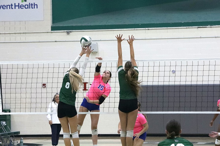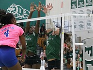 FPC's Cameron Graham (1) and Haley Sobin (6) try to block a Sanigh Arneaud spike. Photo by Brent Woronoff