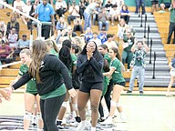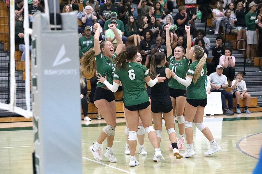 The Bulldogs celebrate after winning the second set. Photo by Brent Woronoff
