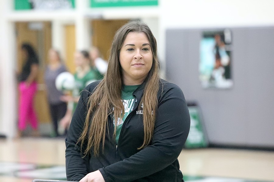 FPC coach Lindsey Stewart gives instructions to outside hitter Marina Carlisi (8). Photo by Brent Woronoff
