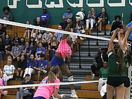 FPC's Faith Dailey (11) hits over the net. Dailey had one kill to go along with 14 digs and 40 assists. Photo by Brent Woronoff
