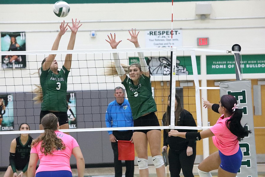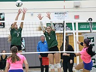 FPC's Sophie Campbell (3) and Marina Carlisi (8) go up for a block. Photo by Brent Woronoff