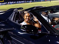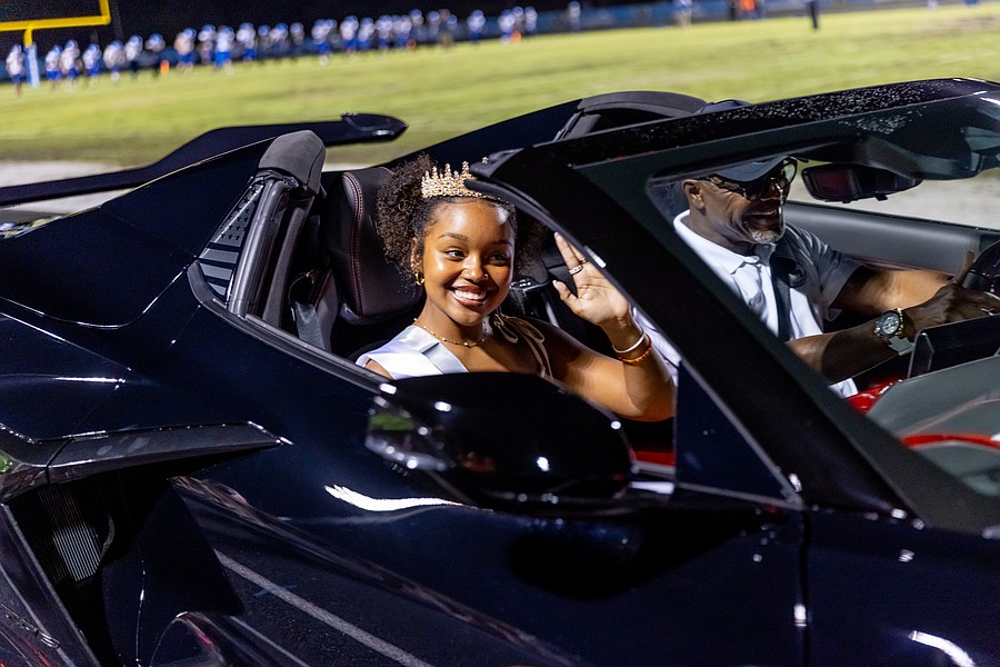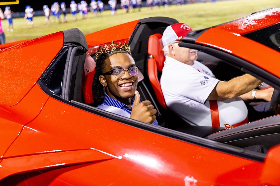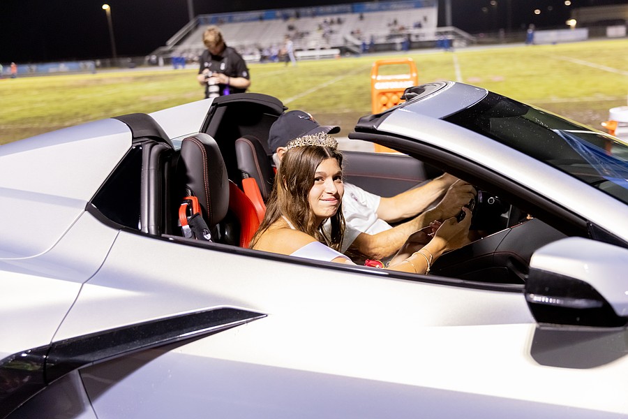 Homecoming queen Paityn Lawrence waves as she begins her ride around the track in a Corvette. Photo by Keishia McLendon