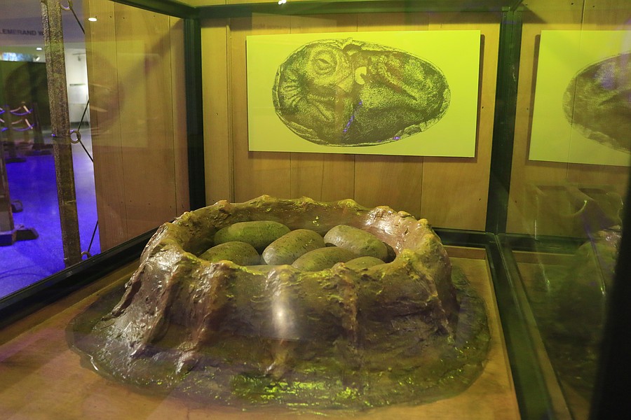 The dinosaur exhibit at MOAS has several cases with replica skulls, bones and dinosaur eggs, many of which are interactive. Photo by Sierra Williams