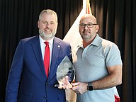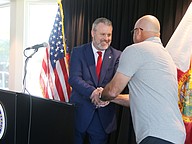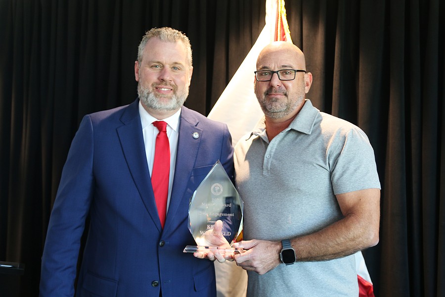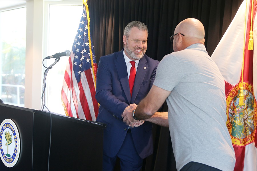 Ormond Beach Mayor Jason Leslie shakes restaurateur Kevin Wakefield's hand during the 2025 State of the City address on Tuesday, Oct. 14. Photo by Jarleene Almenas