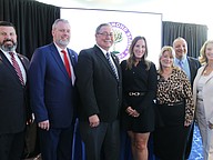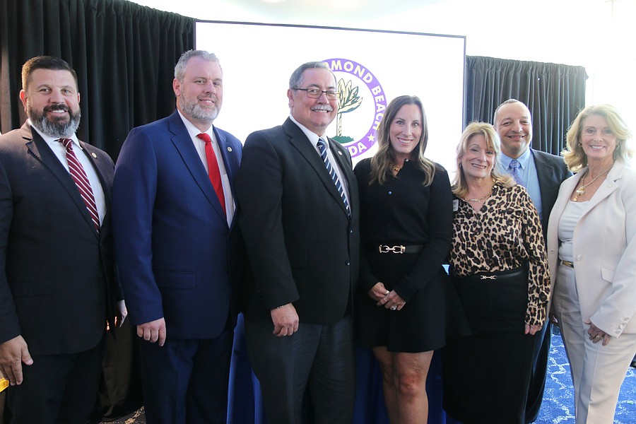 Ormond Beach City Commissioner Travis Sargent, Mayor Jason Leslie, City Commissioners Harold Briley and Kristin Deaton, Chamber President Debbie Cotton, Chamber Board Chair Eric Palacios and Deputy Mayor Lori Tolland. Photo by Jarleene Almenas