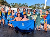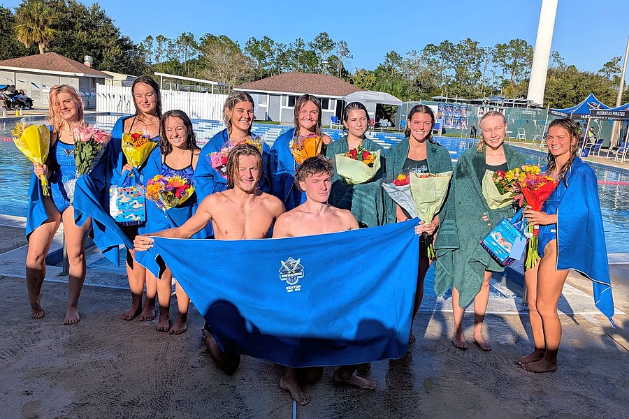 The Pirates and Bulldogs recognized their seniors on the teams’ combined Senior Day. Each senior got the splash treatment from both sides as they walked out of the pool to receive a towel and gifts. Matanzas honored eight seniors: Carmella Cuccinello, McKenzie Manhart, Morris, Lily Gerkin, Mandy Flaherty, Keaton Lasicki and Adianna DeOliveira. FPC honored their three seniors: Noble, Violet Radoncipi and Mallory Blackburn.