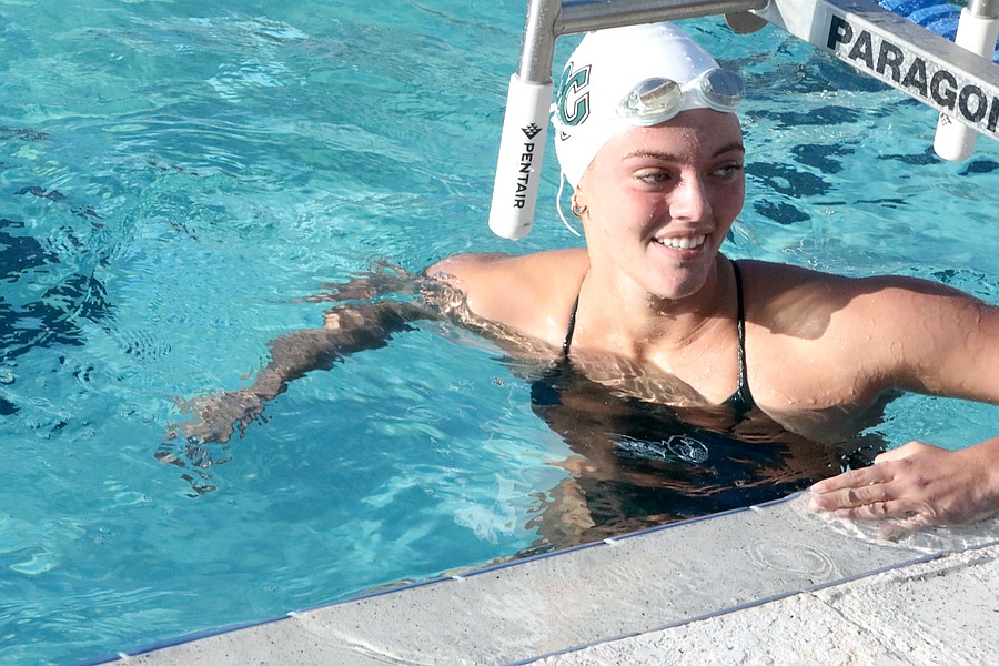 After getting splashed by swimmers from both sides, FPC's Matilda Noble walks out of the pool to be honored on Matanzas-FPC Senior Day at the Palm Coast Aquatics Center. Photo by Brent Woronoff