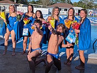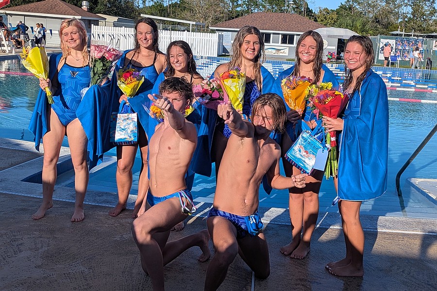 Matanzas and FPC seniors at the swim teams' Senior Day. Back row: Matanzas' Lily Gerkin, Ellie Sexton, Adianna De Oliveira, Mandy Flaherty, Carmella Cuccinello, FPC's Violet Radoncipi, Matilda Noble, Mallory Blackburn and Matanzas' McKenzie Manhart. Front: Matanzas' Keaton Lasicki and Oliver Morris. Photo by Brent Woronoff