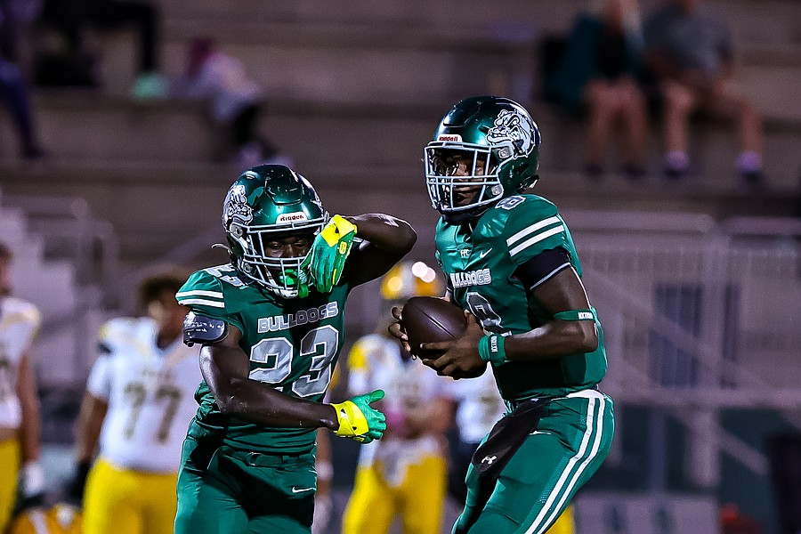 FPC running back Ehimen Ajede (23) is ready for a handoff from quarterback La'Darius Simmons on this RPO play. Photo by Keishia McLendon