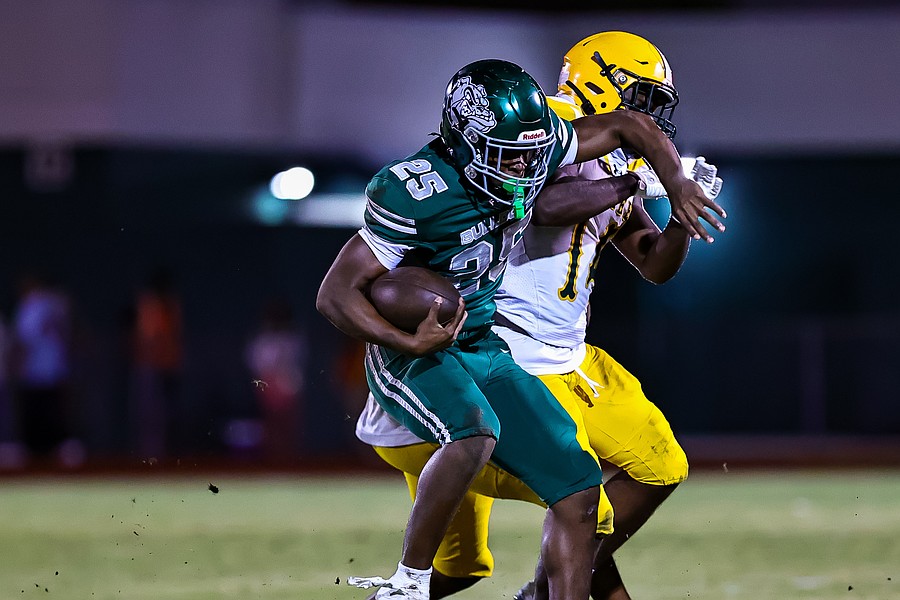 FPC running back Darwin Harris (25) fends off a Yulee defender. Photo by Keishia McLendon