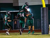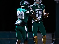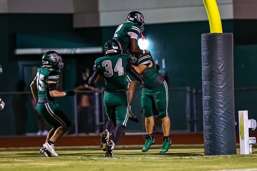 Brian Gunter celebrates with Logan Jacobelli (19) in the end zone after Jacobelli caught a 40-yard touchdown pass. Photo by Keishia McLendon