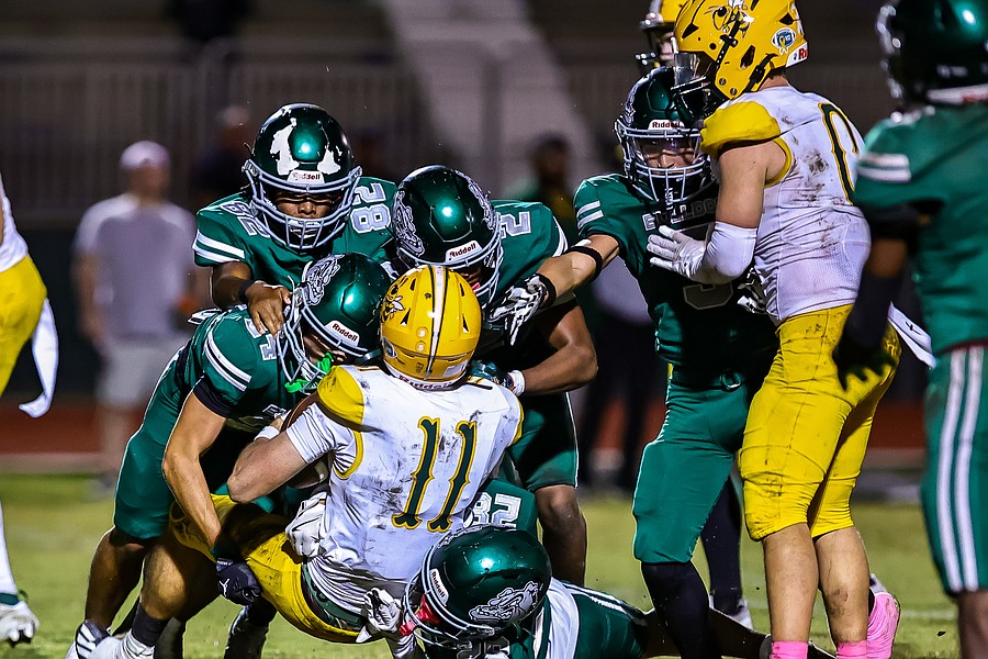 A pack of Bulldogs tackle Yulee's Preston Matricardi (11). Photo by Keishia McLendon