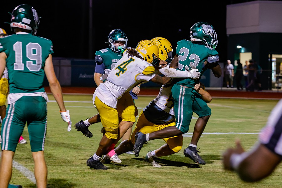 FPC running back Ehimen Ajede (23) breaks tackles on a run. Ajede scored two touchdowns against Yulee. Photo by Keishia McLendon