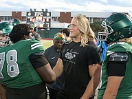 North Carolina State freshman defensive end Colby Cronk, center, greets his former FPC teammates at the Bulldogs' Homecoming game. Photo by Brent Woronoff