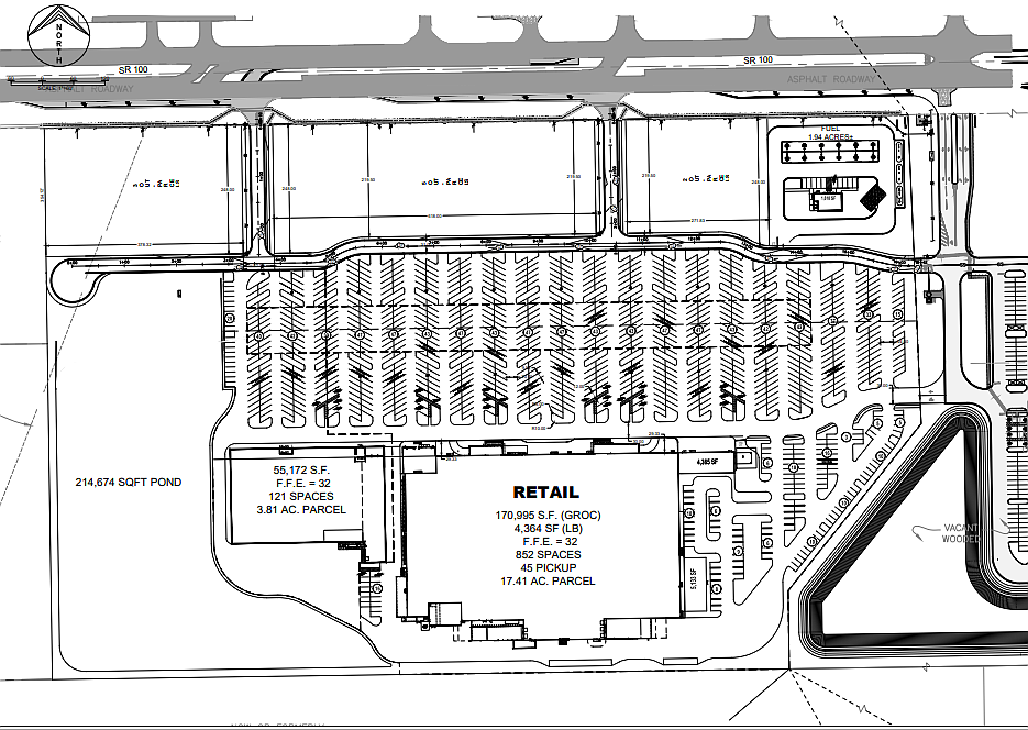 According to a tentative site plan, the lot will have 852 parking spaces and 45 pickup spaces for the main building. A second, smaller, 55,000-square-foot building adjacent to the main store would have 121 spaces. Outlines of a stormwater pond and a 1.94-acre section with a gas station are also included on the site plan.