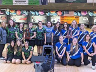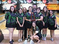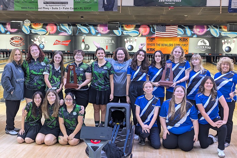 District 3 girls bowling champs, Flagler Palm Coast Bulldogs: Destiny Bonvouloir, Casey Martin, coach Vicky Eaton, Victoria DaSilva Carvalheira, coach Kevin Hand, Izzy Oliva, Mya Kelly, Jenet Serrano, Kailyn Ball (front). Photo by Brent Woronoff