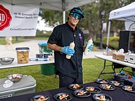 The Grind Gastropub Chef Wicho Rodriguez adds sauce to sample plates. Photo by Sydney Tevin