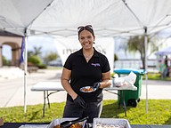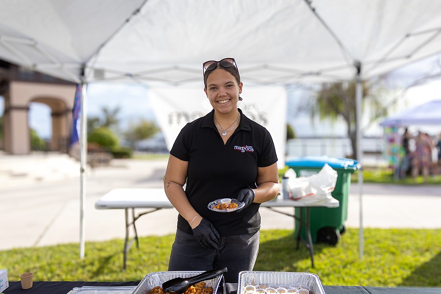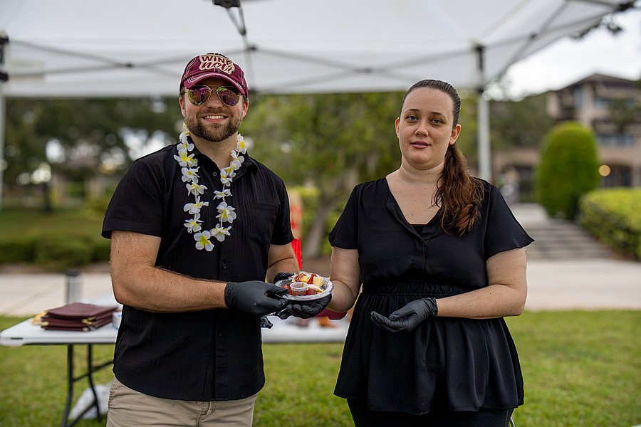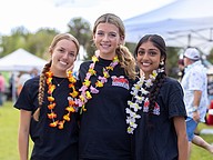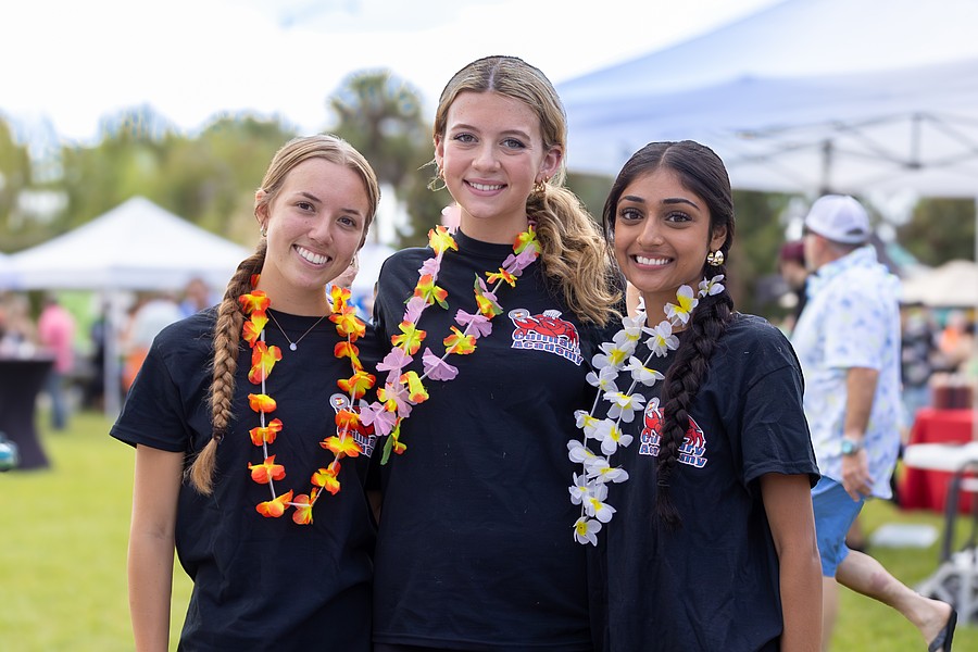 Seabreeze culinary students Adyson Doherty, Isabel Mazelow and Diya Patel, smile for the camera. The students handed out leis to attendees, allowing other vendors to know who could sample the food. Photo by Sydney Tevin