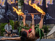 A Polynesian fire dancer performs a trick on stage, holding a fire stick with his feet. Photo by Sydney Tevin