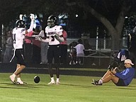 Brady Putis (11) congratulates Ladarien Baker after Baker's touchdown catch put the Pirates up 14-0. Photo by Brent Woronoff