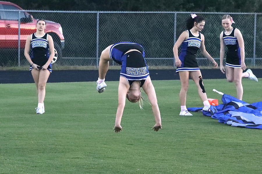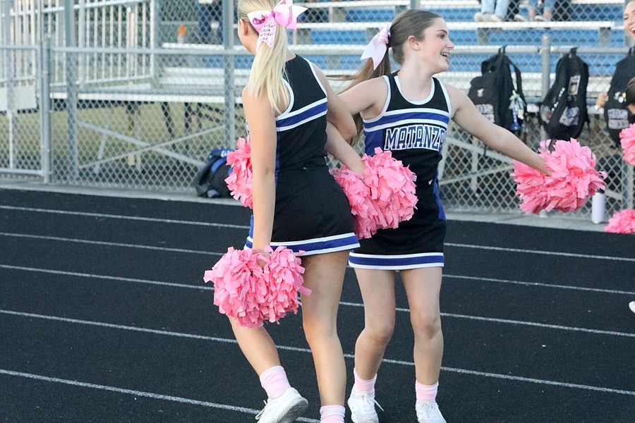 Matanzas cheerleaders Gracie and Naomi swing around before the game. Photo by Brent Woronoff