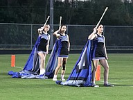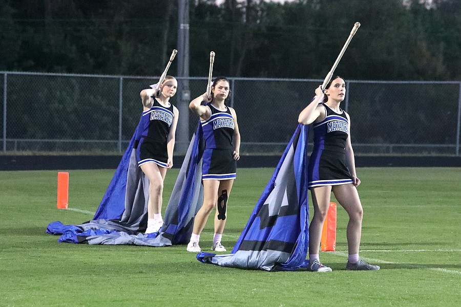 Matanzas cheerleaders Camry, Summer and Hadley get the flags ready for the team's entrance. Photo by Brent Woronoff