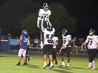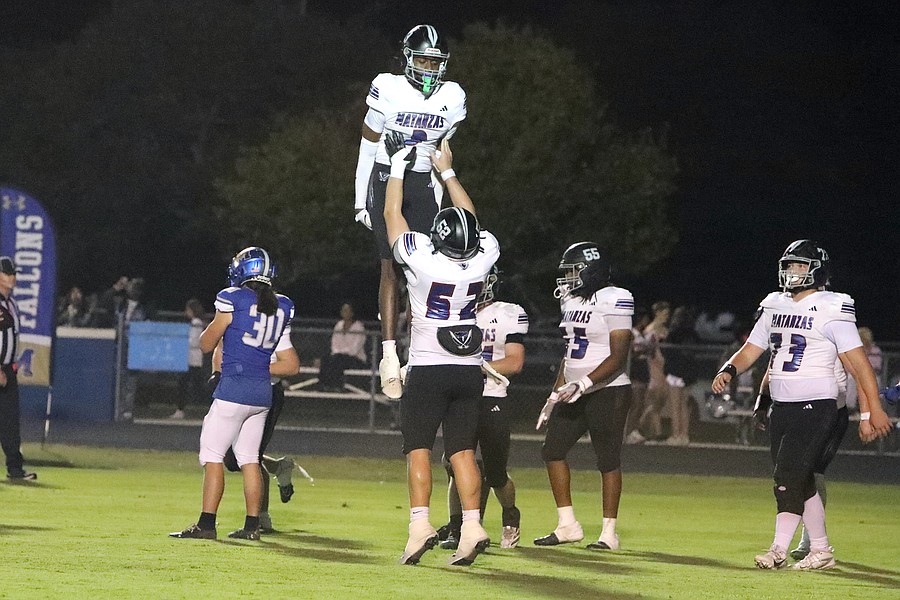 Offensive lineman Logan Walker (52) hoists Ladarien Baker into the air after the receiver scored in the third quarter to give Matanzas a 14-0 lead. Photo by Brent Woronoff
