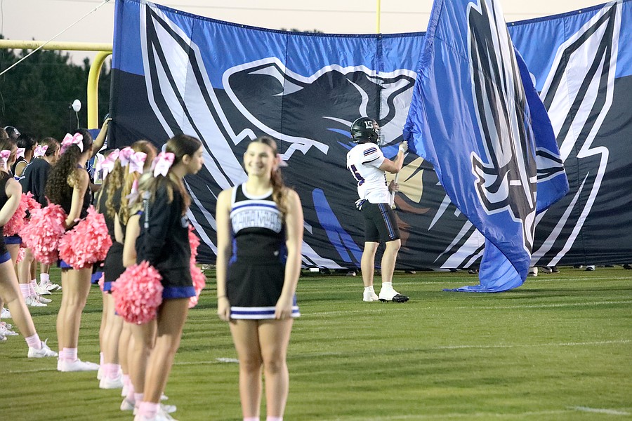 Matanzas senior Rylee Roberts is ready to lead his teammates onto the field as the Pirates' cheerleaders line up. Photo by Brent Woronoff