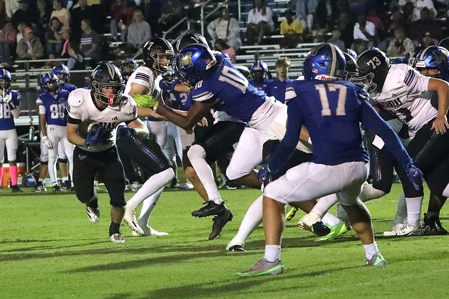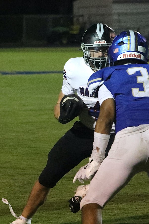 Matanzas receiver Jordan Schendorf tries to evade Menendez's Kayne Vona (3). Photo by Brent Woronoff