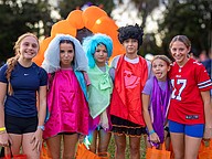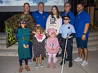 Costume contest winners (front) Elise Emberley, Ava Emberley, Olivia Kuczmera and Knox Deaton stand with the judges: (back) Bill Navarra, co-owner of Realty Pros Assurred; Ormond Beach Mayor Jason Leslie, and City Commissioners Kristin Deaton, Harold Briley and Travis Sargent. The children won the categories for most unique, scariest, cutest, and most original. Photo by Sydney Tevin