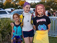 Ellie McDade, Clarity Collins and Sparrow Lee Collins pose together. The three dressed as Zoey, Rumi, and Mira from the movie "K-pop Demon Hunters." Photo by Sydney Tevin