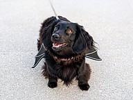 Long-haired dachshund Luna dresses as a bat for Halloween. Photo by Sydney Tevin