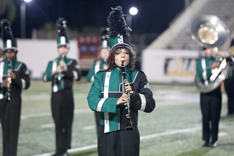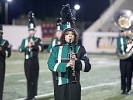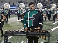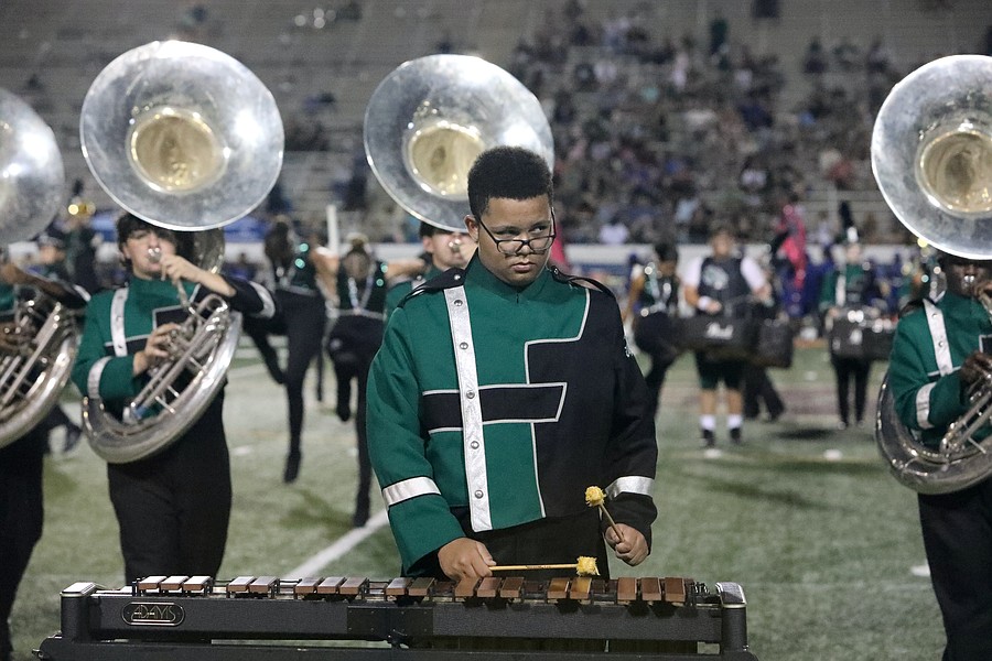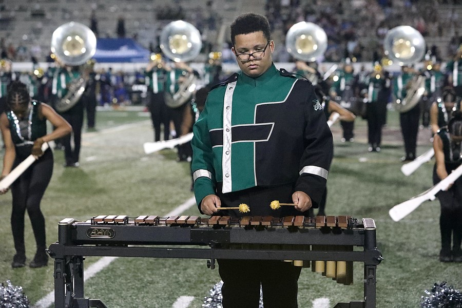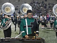 FPC band member Cayden White plays the xylophone at halftime. Photo by Brent Woronoff