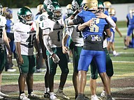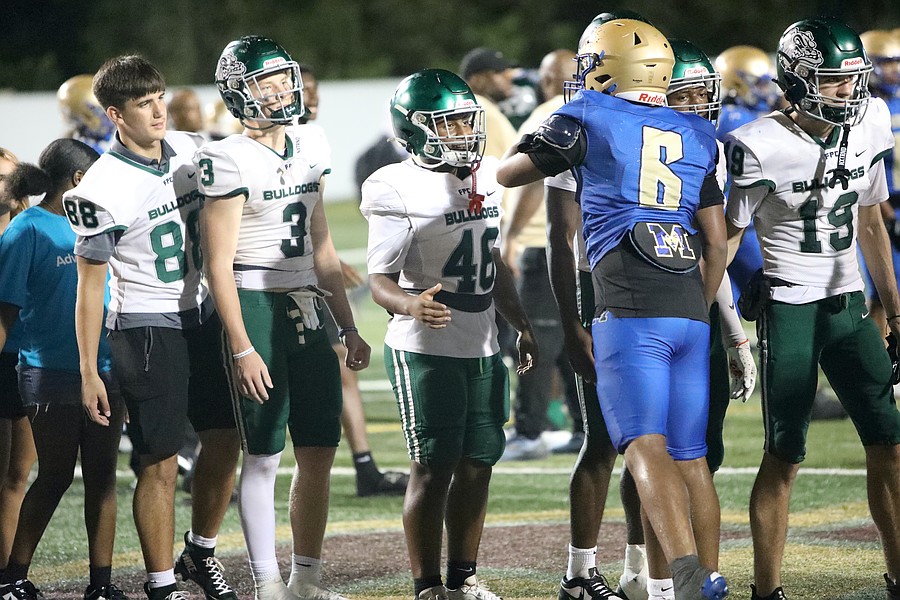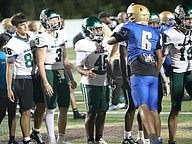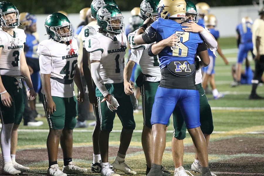 Mainland running back Braylyn Simmons (6) hugs his former FPC teammates in the handshake line. Photo by Brent Woronoff