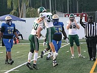 FPC's Caleb Shamblin (35) celebrates with Josiah Hathaway (30) after Hathaway intercepted a pass in the first quarter. Photo by Brent Woronoff